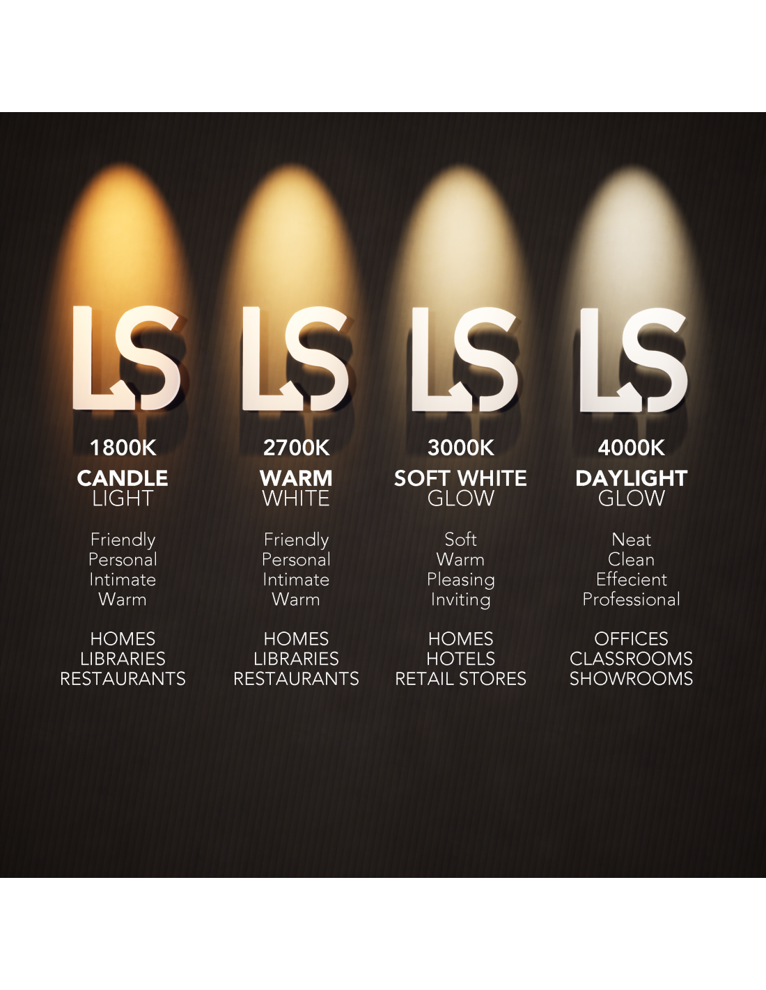 Die Lichtfarbe wird in Kelvin (K) angegeben. 2700–3000K = warmweiß, 4000K = neutralweiß, 6500K = tageslichtweiß.